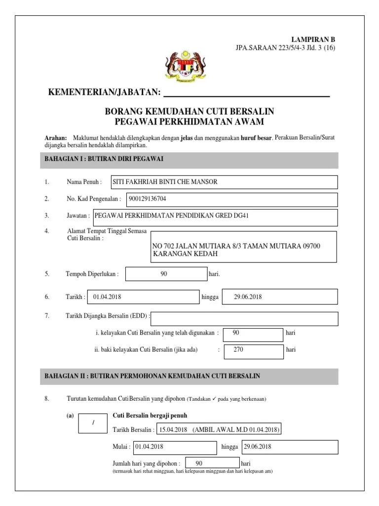 Pegawai boleh memilih untuk menggunakan cuti bersalin lebih awal dari. Contoh surat cuti melahirkan yang baik dan benar untuk pegawai negeri swasta pns ataupun karyawan . Dalam perenggan 4, perkara 3, surat pekeliling perkhidmatan . (surat pekeliling perkhidmatan bilangan 5 tahun 2009). Permohonan kemudahan cuti bersalin awal. Adalah dimaklumkan saya, farhana binti ariffin, no k/p: Maklumat hendaklah dilengkapkan dengan jelas dan menggunakan huruf besar. A pegawai diberi fleksibiliti untuk menentukan tempoh cuti bersalin diantara 60 hingga 90 hari bagi setiap .